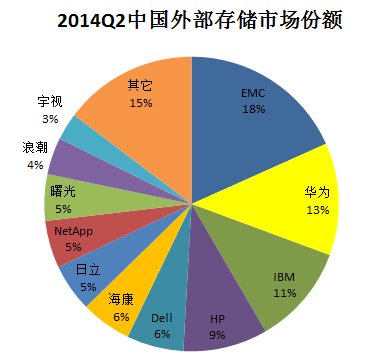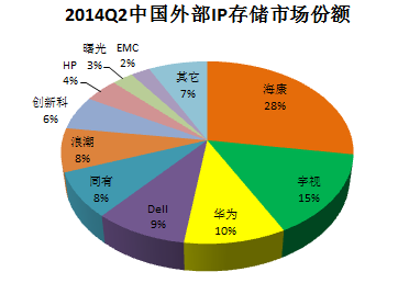 從出貨量角度分析,2014年第二季度前5名中國產廠商除華為以11%排名第三外,海康威視以10%超越HP、IBM位列第四位,一、二、五位被DELL、EMC、HP占據,IBM跌出前5。國產廠商增長強勁。