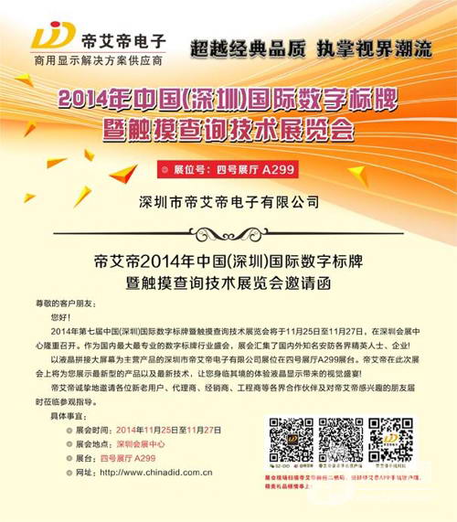 2014第七屆中國(深圳)國際數字標牌暨觸摸查詢技術展覽會,將于2014年11月25日至27日在深圳會展中心拉開帷幕!中國數字標牌展覽會被譽為亞洲最大數字標牌展,是全球數字標牌展頂級年度盛會!深圳市帝艾帝電子有限公司作為液晶拼接行業的知名品牌,此次展會上帝艾帝將攜眾多高清顯示設備以90平米豪華特裝陣容隆重亮相!與廣大客戶分享各種最新技術集成的商用顯示解決方案,帝艾帝展位號:四號展廳A299!歡迎廣大客戶蒞臨指導!