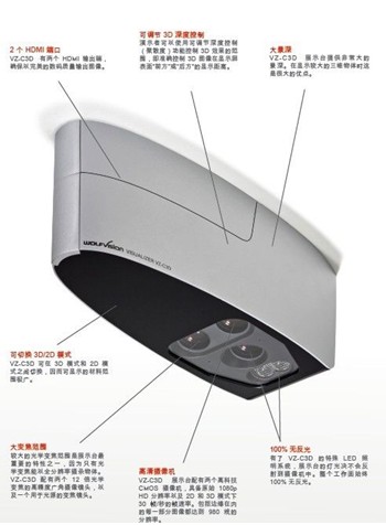 在保證已有產(chǎn)品品質(zhì)的同時(shí),沃府視訊緊跟時(shí)代潮流,在Infocomm China 2013展出了世界首款 3D 展示臺(tái)——VZ-C3D, 配有兩個(gè)高精度鏡頭和一個(gè)機(jī)載立體混合器,擁有完美的3D成像功能,可實(shí)現(xiàn)整幅圖像(包括邊緣)的高分辨率、逼真的色彩、高幀率、快速而精確的自動(dòng)對(duì)焦、流暢的變焦、無失真、無反光或熱點(diǎn)的均勻照明等等功能,卓越的性能使它頻繁的出現(xiàn)在3D應(yīng)用中,例如視頻會(huì)議、遠(yuǎn)程出席、醫(yī)療、產(chǎn)品設(shè)計(jì)、工程、科研、教育等等。