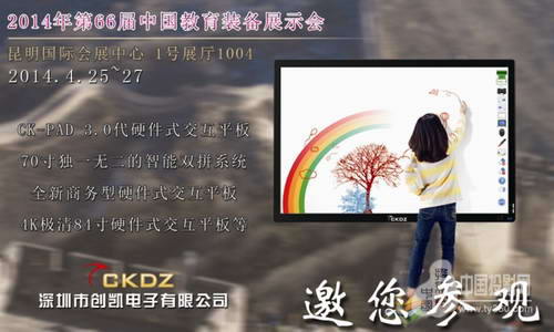 2014年4月25日至27日,第66屆中國教育裝備展示會即將在昆明國際會展中心揭幕。深耕教育領(lǐng)域多年的視聽行業(yè)圖形圖像控制器專家深圳市創(chuàng)凱電子有限公司屆時將出席展會,并帶來公司旗下最新的交互式平板等新品。