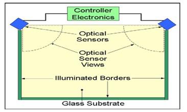 光學(xué)觸摸在觸摸屏頂端兩個(gè)角處,兩個(gè)攝像頭(下圖所示的藍(lán)色方塊)分別發(fā)出光線,經(jīng)過四周的反射條反射傳入對方。這樣光線就在觸摸屏上交織成一張光網(wǎng)。接觸到觸摸屏?xí)r就會擋住那一點(diǎn)的光線,射出光線和接受光線分別與觸摸屏頂端的水平線形成兩個(gè)夾角。觸摸屏長度是既定的,通過簡單的幾何知識就可以計(jì)算出觸摸點(diǎn)的坐標(biāo)并做出反應(yīng)。