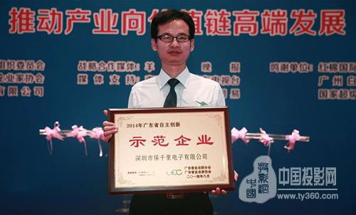 8月19日,以“推動產(chǎn)業(yè)向價值鏈高端發(fā)展”為主題的首屆廣東省企業(yè)自主創(chuàng)新活動周開幕式暨企業(yè)創(chuàng)新成果發(fā)布會在廣州舉行。深圳市保千里電子有限公司獲評“2014年廣東省自主創(chuàng)新示范企業(yè)”殊榮,保千里副總裁陳楊輝出席領獎。