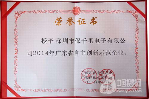 保千里獲“2014年廣東省自主創(chuàng)新示范企業(yè)”榮譽證書
