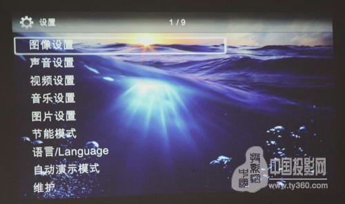 打開設置菜單,可以看到圖像設置、視頻設置、音樂設置、圖片設置、節能模式以及語言設置等等。在這些設置中,關鍵的參數設置應該說是圖像設置,在圖像設置中,用戶可以設置投影模式、墻壁顏色校正、智能設定、亮度、對比度和飽和度設置,而在視頻設置中并沒有這些參數的選定,如果用戶想調整視頻的參數,用戶可以在圖片設置中搞定。