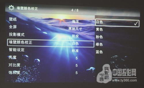 在智能設置中,當然商務用戶可以根據使用環境和需求進行投影模式的調整,比如說前投,天花板背投等等模式;另外還可以調整墻壁的顏色進行校正,比如說默認為白色,還可以選擇黃色、粉色、藍色等背景顏色。此外在設置參數中,還可以調整打開自動演示模式,輔助商務用戶的使用。