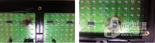 第三,P10單面板LED管腳只能單面上錫,長期熱脹冷縮條件下易造成虛焊,可靠度極低,造成功能不良。反之,P10雙面板,有過孔導錫,散熱好,抗冷熱能力強,粘性好,LED管腳焊點可靠。