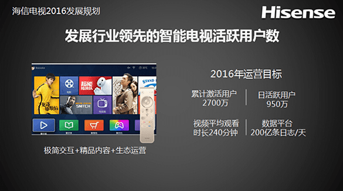 2016年,海信智能電視的運營目標是,累積用戶數達到2700萬,日活躍用戶達到950萬,視頻平均觀看時長240分鐘,日廣告曝光量15000CPM。