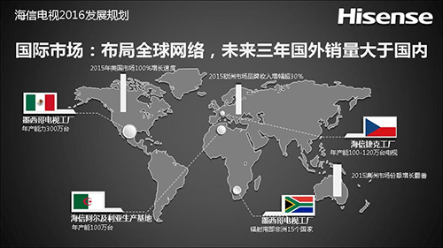 2015年,海信海外產業布局進一步擴張。在美洲,海信成功收購夏普墨西哥電視工廠及其電視業務;在歐洲,海信捷克工廠順利投產;在南非,海信南非工廠完成了擴建改造;在阿爾及利亞興建了電視生產基地。海信全球生產布局已初具規模。海外市場表現方面,2015年,海信電視自有品牌在美國市場獲得了100%的增長速度,澳洲市場份額增長幾近翻番,歐洲市場品牌收入增長30%以上,南非市場銷量位居前兩位。