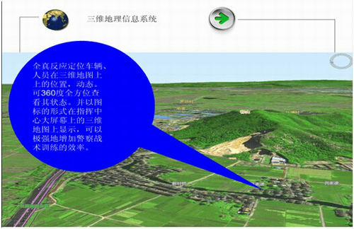 軍事行動、演習:可視化指揮系統三維地理信息系統的顯示:包括(電子地圖),監控系統(以固定為主,車載、無人機為輔),GPS人車定位系統,單警圖傳系統,車載圖傳系統,無人機圖傳系統,語音對講系統)