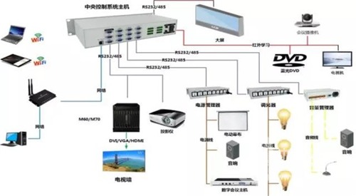 中央控制系統是對聲、光、電等各種設備進行集中控制的設備,通過計算機和中央控制系統軟件控制投影機、影碟機、錄像機、卡座、功放、話筒、計算機、筆記本、電動屏幕、電動窗簾、燈光、矩陣等設備。