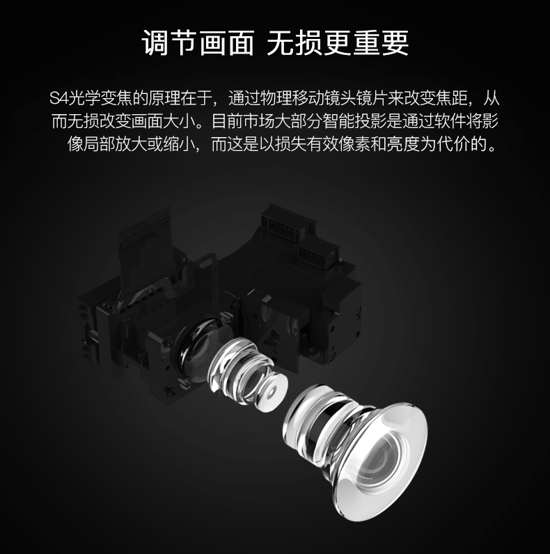 S4配備的1.3X無損光學(xué)變焦,被稱為投影光學(xué)變焦時(shí)代的1080P,是酷樂視2013年在發(fā)布“酷樂視X5智能影院”時(shí),提出的“光學(xué)高清”概念的一個(gè)完美升華。