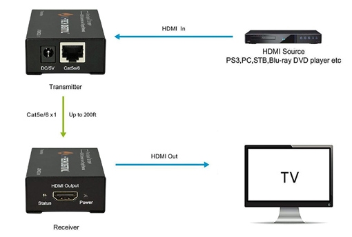 實體布局以及設置跟采用網線延長的方法類似。HDMI信號端連接到一個發(fā)射器端,把HDMI信號轉換成光纖或者同軸信號,傳遞到接收端,再轉換回HDMI信號。