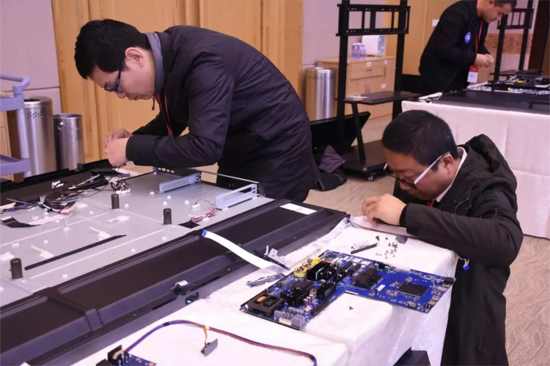 極速拆裝是工程師給用戶提供高效服務體驗的必備技能,兩人一組在規定的時間內完成整機拆裝,講究的是快而準地完成合作。工程師們你拆我裝、你遞工具我接線,動作一氣呵成,配合得天衣無縫。考驗的不只是工程師的實踐能力,還有協同合作的意識。除此之外,個人還要對希沃常態化錄播、希沃云班牌、希沃易課堂等產品進行全面的考核,對應用軟件的相關功能進行演示及講解,對教學輔助設備的調試等,充分考驗每一位工程師的綜合能力。