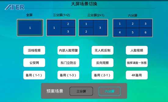 視頻指揮系統采用Videolink慧顯綜合管理平臺將來自攝像機、電腦和筆記本等設備的信號自由切換到2×3拼接大屏上顯示或到錄播設備。慧顯還支持單屏四窗口畫面等分顯示,可同時查看更多信號數據,每個子窗口的信號允許任意切換,其中圖像的亮度、對比度、顏色、透明度可自由調節。同時,慧顯采用H.264、H.265編解碼技術,可對各品牌IP標準攝像機、各品牌專用編碼端進行解碼,具備同時處理4路1080p、8路720p、16路480p的解碼能力,并且具備同時處理4路1080p@60Hz、1路4K信號編碼能力。最終,可在拼接大屏上實現全屏、多畫面、畫中畫以及單屏多畫面的任意呈現,加速人與信息、數據的交互,進而提高安保能力。