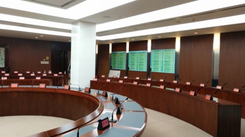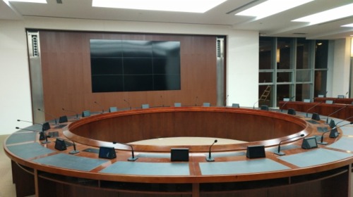 成都市政府101會議室是進行每周常務(wù)會議及工作會議的重要場所,使用頻率高,會議室以圓桌加扇形桌擺放形式,坐席為103個,均需要鵝頸會議話筒,且需要103支話筒全開,發(fā)言完畢才會關(guān)閉話筒,原系統(tǒng)使用音柱揚聲器兩只,聲場均勻度差,語言清晰度差,且容易產(chǎn)生嘯叫,不能滿足客戶使用需求。