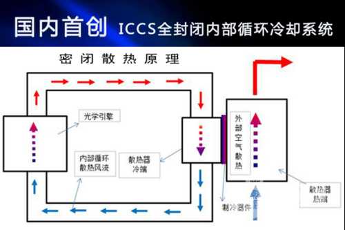 首創專利技術ICCS(Internal Circulating Cooling System)光機全密閉內部循環冷卻系統,光機系統全密閉保護,有效隔絕灰塵侵入。高效的內部循環冷卻系統讓投影機始終保持“神清氣爽”的狀態,保證投影機的畫面質量和穩定性,提高投影機的使用壽命。