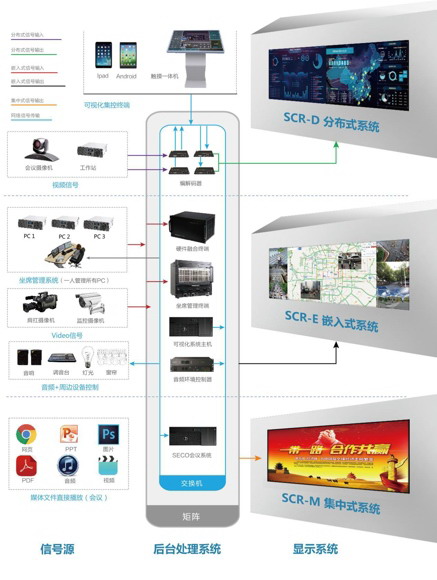 以監控、指揮為主的大中型顯示系統,一般要求7*24小時連續開機,接入信號源及顯示到大屏幕上的信號源眾多、類型復雜,涵蓋PC、攝像機、視頻會議、其它終端等,包含的信號接口有DVI、VGA、HDMI、SDI、video、IP、DP等等,因此對后臺要求最為苛刻。