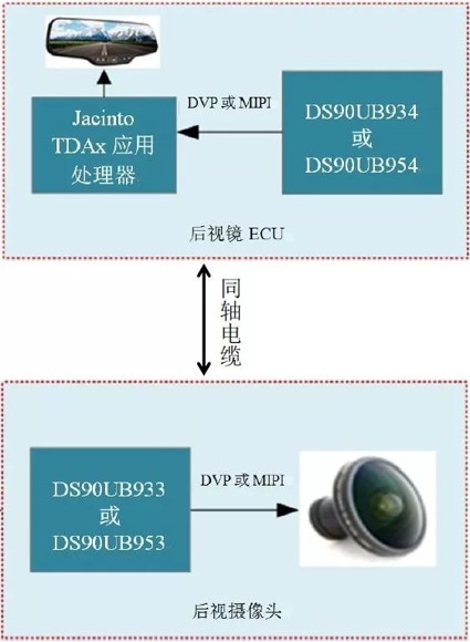 從車輛后方來看,成像器的視頻數據輸入到TI的DS90UB933并行接口串行器或具有攝像串行接口(CSI)-2的DS90UB953串行器。然后將這些數據通過平板顯示器(FPD)-Link III同軸電纜串行到DS90UB934或DS90UB954解串器,然后輸出到應用處理器進行視頻處理(例如JacintoTM TDAx處理器),然后顯示在后視鏡顯示屏上。如果顯示屏遠離Jacinto應用處理器,則需要顯示接口串行器和解串器將數據通過同軸電纜再次路由。您可以分別使用DS90UB921和DS90UB922紅綠藍(RGB)格式串行器和解串器,或者,如果您要應用更高分辨率的顯示屏,則可以使用DS90UB947和DS90UB948開路低壓差分信號顯示接口(LDI)器件。