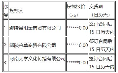 第一中標候選人:河南太學文化傳播有限公司投標報價:******0.00元 交貨期:簽訂合同后15 日歷天內