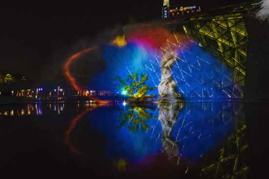 本屆廣州國(guó)際燈光節(jié),Vivitek(麗訊)用2臺(tái)18000流明激光工程投影機(jī)DU9800Z打造了6號(hào)作品《時(shí)代之鏡》。此作品位于廣州大劇院前的水池上,靈感源于平行宇宙理論,表現(xiàn)方式與去年燈光節(jié)的網(wǎng)紅作品《美好生活》相似。《時(shí)代之鏡》以水為幕,將光的色彩投影在朦朧的水幕上,配合實(shí)驗(yàn)電子舞曲風(fēng)格的音樂(lè),通過(guò)聲光電的整體演出令觀眾在體驗(yàn)上穿破現(xiàn)有的感知層面,帶出快樂(lè)的感受。