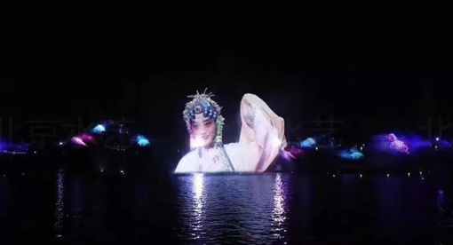 在音樂噴泉即將結束的時候,一曲經典柔美的《皂羅袍》縈繞湖面,驚醒了還沉浸在音樂水秀中的每一個人。伴隨著水幕昆曲的序幕逐漸拉開,曲聲越發婉轉悠揚,人物畫面也映射于水幕之上,色彩斑斕,如夢似幻,讓在場的人們仿若置身仙境……