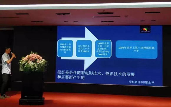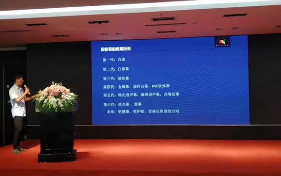 XY銀幕代表黃志豪談到投影幕是伴隨著電影技術、投影技術的發展和需要而產生的,1640年一種叫魔法燈的幻燈機被發明;幻燈機的工業化生產開始于1845年;1989年世界上第一臺液晶投影機—愛普生的VPL-2000誕生;1903年世界上第一塊投影屏幕產生。