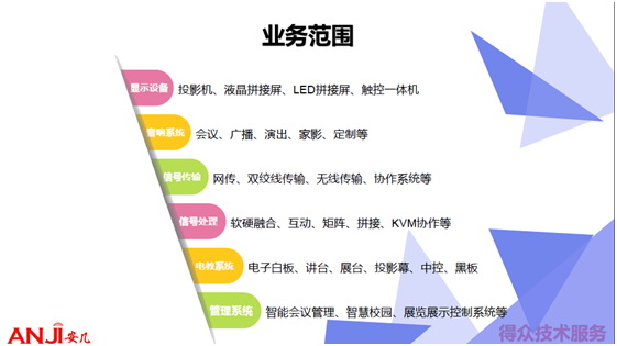 廣州得眾信息科技有限公司是一家專業(yè)于投影系統(tǒng)、音視頻系統(tǒng)及智能化控制管理系統(tǒng)服務的企業(yè),擁有自家的技術團隊、軟件團隊、服務團隊和投影音視頻分銷團隊,與合作伙伴形成更緊密、更高效、更完善的合作機制,提升企業(yè)的核心競爭力。