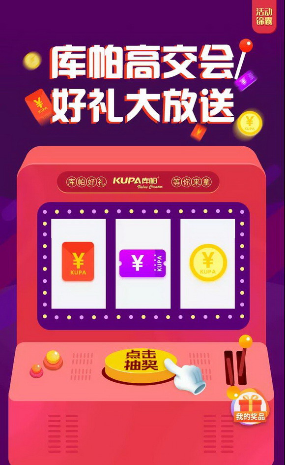 庫帕高交會,好禮大放送,玩老虎機小游戲,即可參與活動,獲得由KUPA(庫帕)準備的小禮品。
