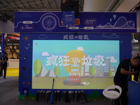 在NEC 1萬流明4K激光工程投影機PX1005QL打造的“垃圾分類”展項,觀眾不僅可以學習垃圾分類常識,還能“通關”贏取精美禮品。其搭配的全新0.37反射式超短焦鏡頭,更短距離可實現更大畫面,為狹小空間的應用提供了靈活的投影解決方案。