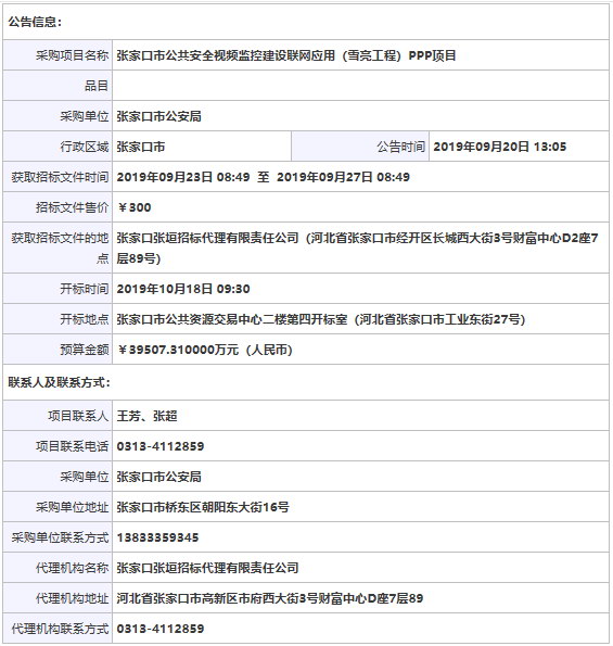 采購項目名稱: 張家口市公共安全視頻監控建設聯網應用(雪亮工程)PPP項目