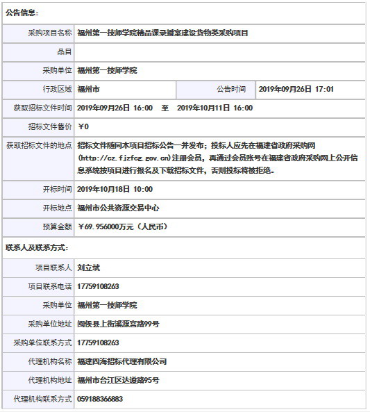 福州第一技師學院精品課錄播室建設貨物類采購項目招標公告