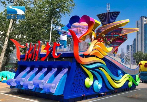 “湖北彩車”呈楚鳳凰造型,身長15米,高10米,寬6米,體重30噸。彩車前部的心形顯示屏,意為兩江交匯;左右兩側裝有曲面顯示屏,展示湖北景觀;車體7米多高處六片巨大的花瓣也是顯示屏,迎風張開;頂端一朵馬蹄蓮,象征著中部崛起。彩車駛過天安門廣場,雖只短短幾分鐘,其中卻凝聚了制作者們和各方人士的汗水和心血。