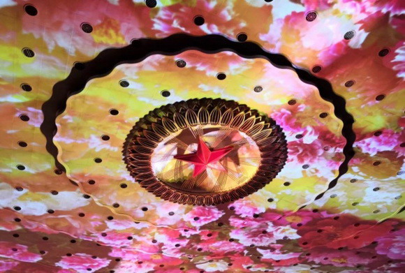 隨著舞蹈歌聲表達情緒的層層遞進,大會堂穹頂上,變幻投映著繽紛十色的光影圖案,生動地呈現出萬里長征、艱苦抗戰、發展生產、建設家園等歷史場景,將演出氣氛一步一步推向高潮。