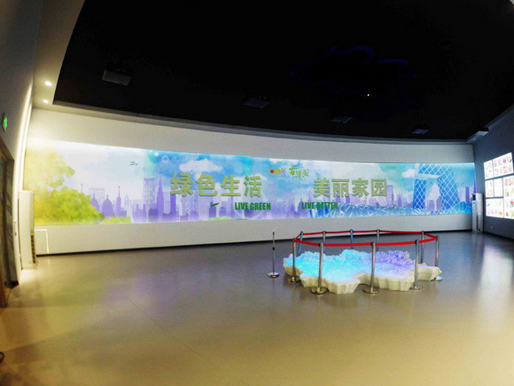 在大廳中央, 一臺BenQ LU951ST 激光工程投影機吊頂安裝,垂直投影出一整塊數字沙盤。