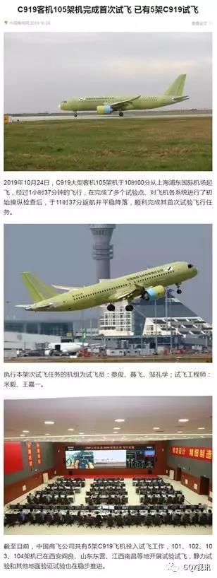 2019年10月24日,C919大型客機第五架試飛飛機105架機當天上午10時從上海浦東國際機場起飛,經過1小時37分鐘的空中飛行,在完成多個試驗點、對飛機各系統進行了初始操縱檢查后返航并平穩降落,順利完成其首次試驗飛行任務。國內眾多媒體都報道了這一喜訊。