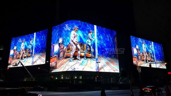 該顯示屏面積1600平方米,結構呈L型,轉角處半徑小于3米的弧面均采用上海三思自主研發的特制顯示模塊,攻克了弧形轉角屏“整屏無縫銜接”的技術難關,以2500萬超高像素成為紐約時代廣場上乃至全球分辨率最高的廣告屏,被業主稱為“最好的顯示屏”,也是目前上海三思在時代廣場最大的顯示屏。