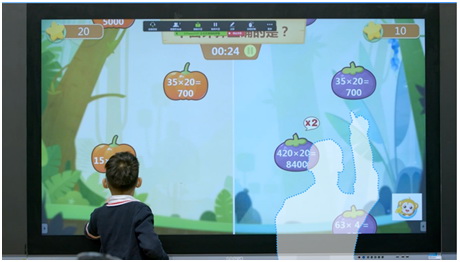 義烏市保聯小學的課堂出現了一個有趣的現象:一位學生在一體機前進行知識PK游戲。臺下的同學揮著小手,恨不能上臺幫他。而本應站他右邊的“競爭對手”不見蹤影,仿佛有位隱形人正操作另一半屏幕。