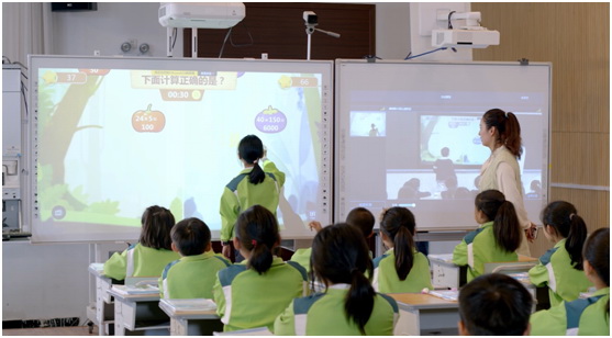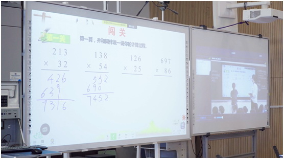 蔣老師說:“在上《三位數乘兩位數》這一課的時候,一開始我讓兩所學校的學生到同一個屏幕上來玩一個游戲。那么孩子的注意力、興奮點,一下子就全部被抓起來了。”