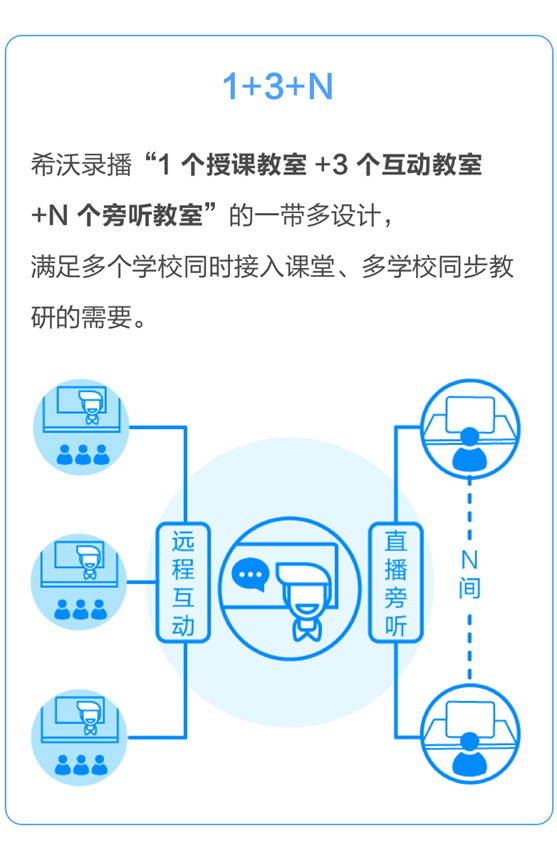 希沃錄播“1 個授課教室 +3 個互動教室 +N 個旁聽教室”的一帶多設計,滿足多個學校同時接入課堂、多學校同步教研的需要。老師足不出校,即可同步教研,實現了教學教研“齊步走”。