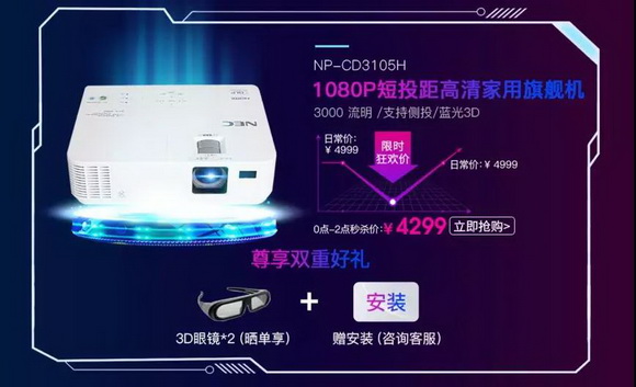 11月11日0點至2點,超值限時秒殺活動將在NEC京東自營官方旗艦店正式開啟。擁有3000流明高亮度、全高清1080P 的NEC CD3105H鉅惠直降400元,限時搶購只要4299元,另可尊享雙重好禮,曬單可獲得兩幅3D眼鏡,還可享受免費安裝,裝機不再求人。