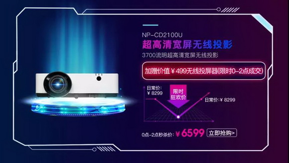 同一時段,秒到就是賺到。3700流明超高亮度、超高分辨率商務辦公投影CD2100U則有著1300元限時大幅降價,首次驟降至6599元,還將附贈無線投屏器超值贈品。
