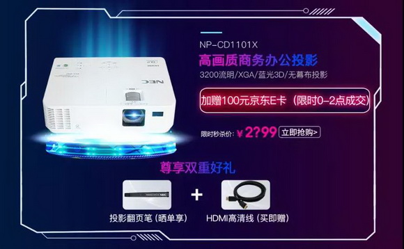 作為絕對主力機型CD1101X,3200流明的高亮度一直是商務辦公人群的優選產品。登錄NEC京東自營官方旗艦店購機可享2399超低特惠價,限時可附贈100元京東E卡,下單即贈HDMI高清線,另外曬單還可獲得投影翻頁筆。