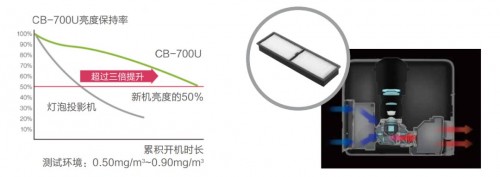 值得注意的是,CB-700U激光超短焦投影機(jī)為應(yīng)對(duì)粉塵的問(wèn)題接入了新款防塵網(wǎng)。新款防塵網(wǎng)不僅采用全新的高效空氣過(guò)濾網(wǎng),更優(yōu)化了防塵結(jié)構(gòu)提高機(jī)器實(shí)際的防塵能力。優(yōu)化過(guò)后的氣流方式可以讓空氣繞過(guò)光學(xué)引擎,防止灰塵雜物對(duì)機(jī)器光學(xué)元件的腐蝕,可以說(shuō)是讓使用者安心又省心。