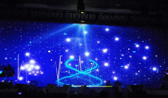 年會現場,鴻合工程顯示團隊通過一臺NEC PH3501QL+工程投影機將動態視頻投射到紗幕上,優秀投影畫質與紗幕既反光又透光的特性完美融合,呈現沉浸式的絢麗畫面,配合藝術家精湛的舞姿,可謂藝術與高科技的完美結合,為觀眾打造了身臨其境的沉浸式體驗。