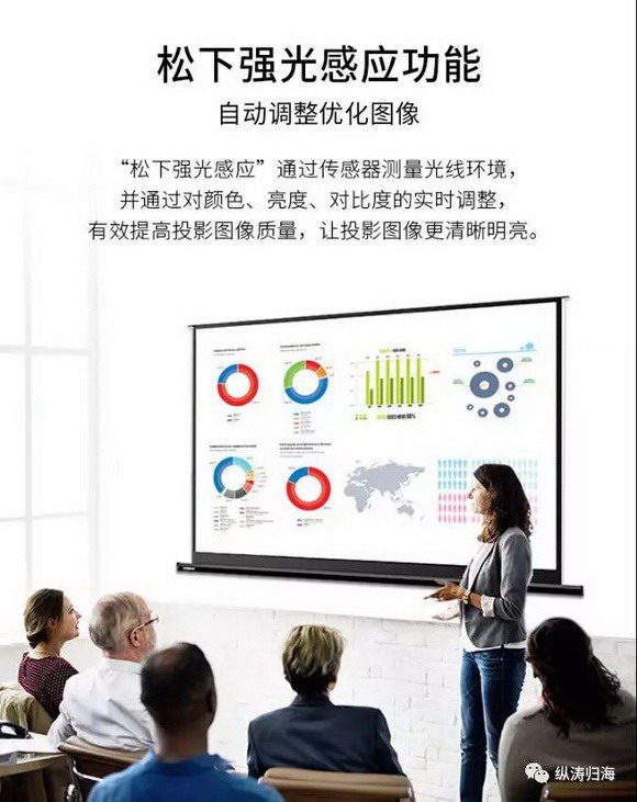 “松下強(qiáng)光感應(yīng)”通過傳感器測(cè)量光線環(huán)境,并通過對(duì)顏色、亮度、對(duì)比度的實(shí)時(shí)調(diào)整,有效提高投影圖像質(zhì)量,讓投影圖像更清晰明亮;