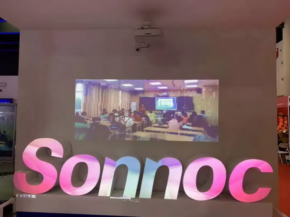 現場吸引觀眾紛紛駐足觀看的還有色彩鮮艷活潑的Sonnoc logo秀,它由兩臺SNP-ELU500T打造而成,是Sonnoc旗下的新款UST工程投影機。采用了藍色激光光源,亮度達到了5000流明。20000小時的光源壽命,大大降低了維護成本。該產品搭配投射比為0.25的超短焦反射鏡頭,可以輕松實現“小空間,大畫面”的功能,滿足有限空間類項目等特殊場景的需求。