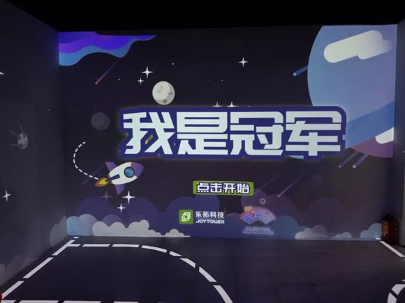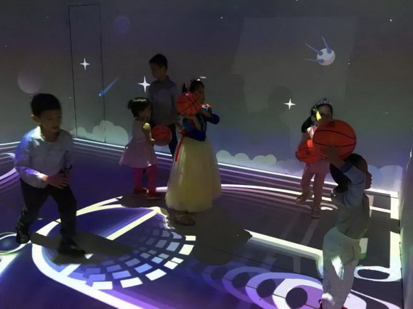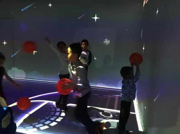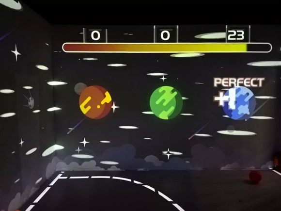 在用視美樂投影機構建的虛擬體育館內,孩子們將球投向墻上的目標,擊中后得分,在規定時間內得分最高的隊伍獲勝。生動逼真的場景、簡單有趣的游戲規則、冠軍的競爭欲,吸引了眾多孩子前來體驗,人氣滿分。