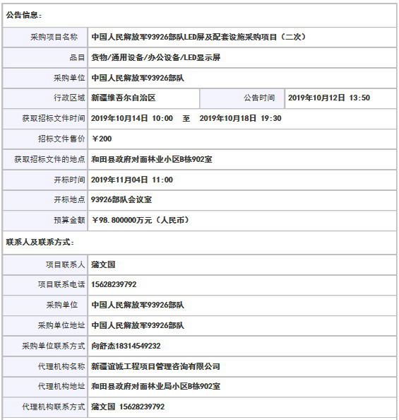 采購項(xiàng)目名稱: 中國人民解放軍93926部隊(duì)LED屏及配套設(shè)施采購項(xiàng)目(二次)
