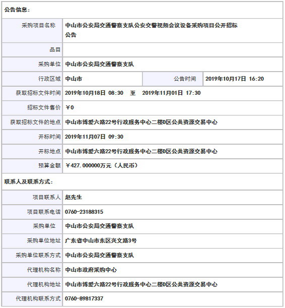 采購項目名稱: 中山市公安局交通警察支隊公安交警視頻會議設備采購項目公開招標公告