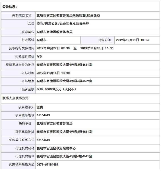 昆明市官渡區教育體育局系統購置LED屏設備公開招標采購信息公告